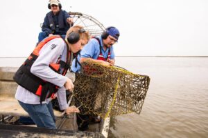 In 2015, CBF relaunched the Abandoned Crab Trap Removal Program, in partnership with the TP&W and increased the effectiveness of the project by securing the Brazoria County Search & Rescue team to provide airboats & pilots to take volunteers recruited by CBF on a search of Christmas Bay for the traps. The crab trap removal program was featured on the front page of the Galveston County Daily Newspaper.